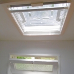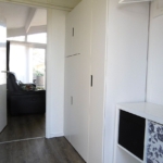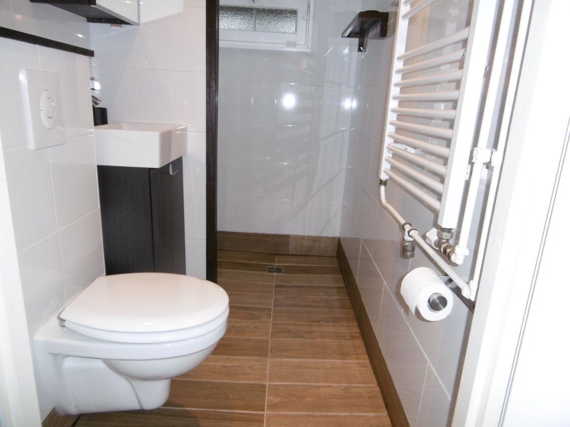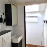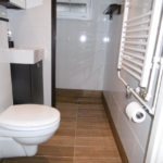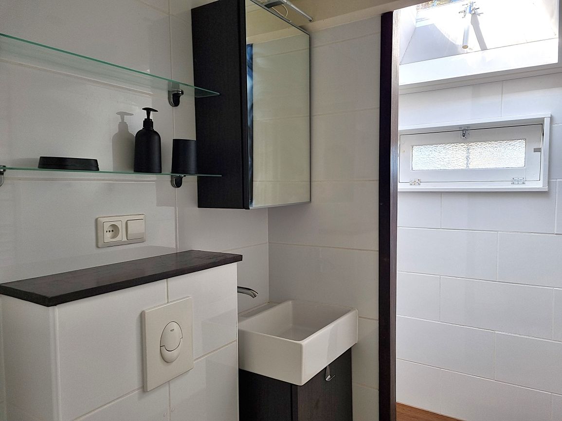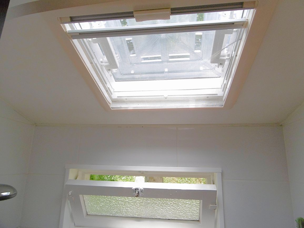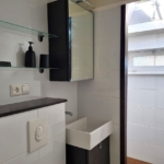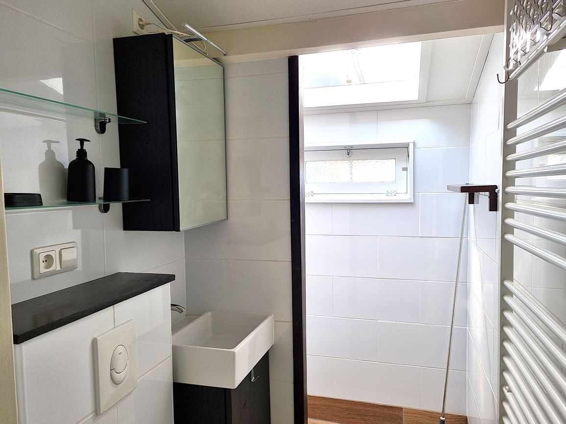 Das Badezimmer ist luxuriös und hat ein zusätzliches Dachfenster, das für Licht und Belüftung sorgt. Die Dusche ist schwellenlos, das Waschbecken hat einen schönen Schrankumbau und einen großen Spiegelschrank. Es gibt ein Wand-WC und einen Design-Heizkörper. Alles ist im Stil der Einrichtung dieses Bungalows gehalten – warme Töne und ruhige Farben.