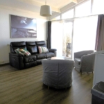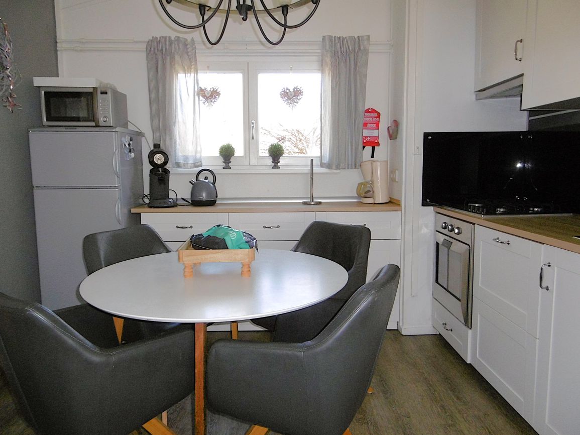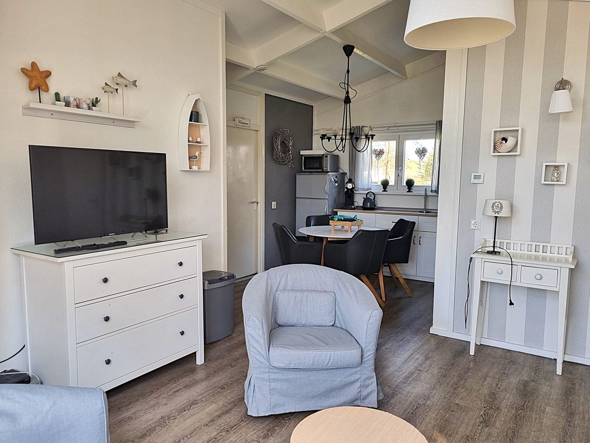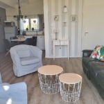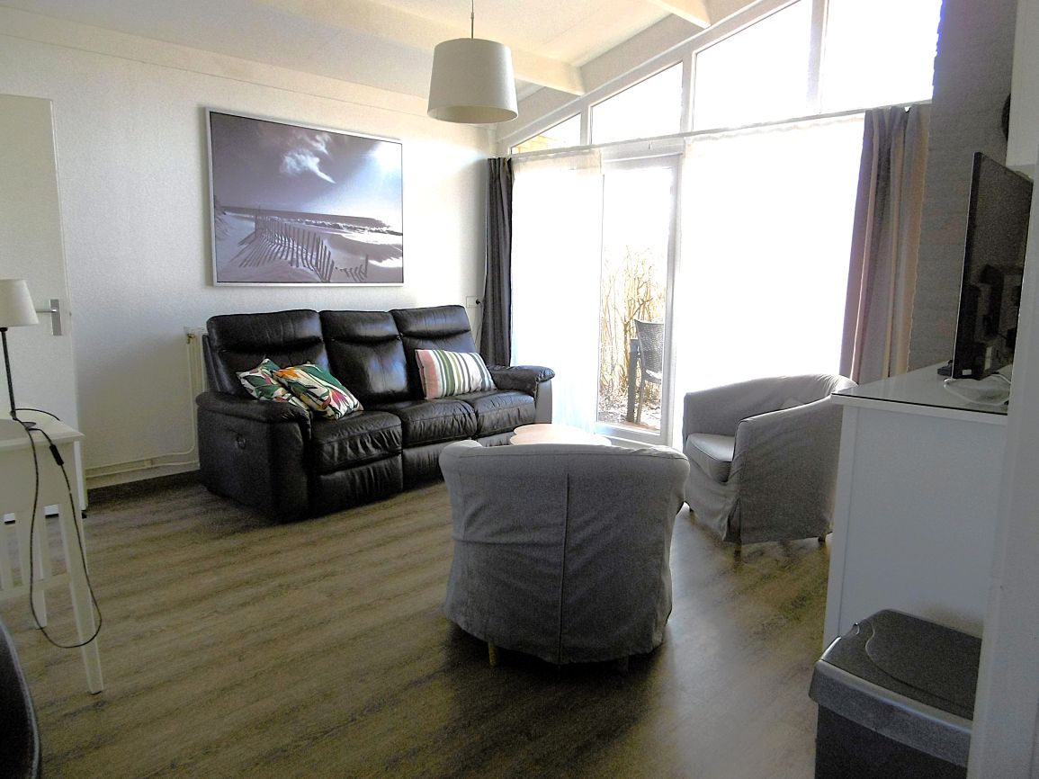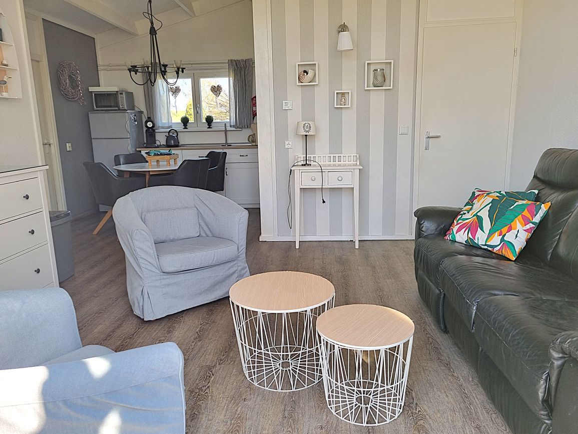 Sie betreten das Haus über eine Diele mit Garderobe und Stauraum und gelangen in das schöne, sonnenorientierte Wohnzimmer mit offener Küche. Das Wohnzimmer ist eingerichtet mit einem Ledersofa, 2 Sesseln und einigen Couchtischen, einem Sideboard für TV- und andere Mediengeräte sowie persönliche Gegenstände. Der Boden dieser Bungalow ist vollständig mit pflegeleichtem PVC in Holzoptik ausgestattet.