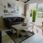 An der Rückseite befinden sich doppelte Terrassentüren, wodurch Wohn- und Außenbereich harmonisch ineinander übergehen. Das helle Wohnzimmer steht in offener Verbindung mit der Küche, die mit einer Spülmaschine, einem 4-Flammen-Kochfeld mit Dunstabzugshaube sowie verschiedenen Kleingeräten ausgestattet ist.
