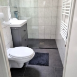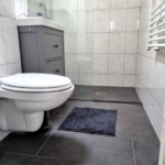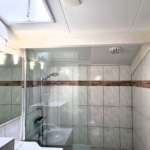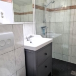 Das Badezimmer wurde vollständig renoviert. Es verfügt über ein wandhängendes WC, einen Designheizkörper, ein Waschbecken mit Unterschrank sowie eine begehbare Dusche mit Glaswand. Ein zusätzliches Dachfenster sorgt für angenehmes Tageslicht und natürliche Belüftung.