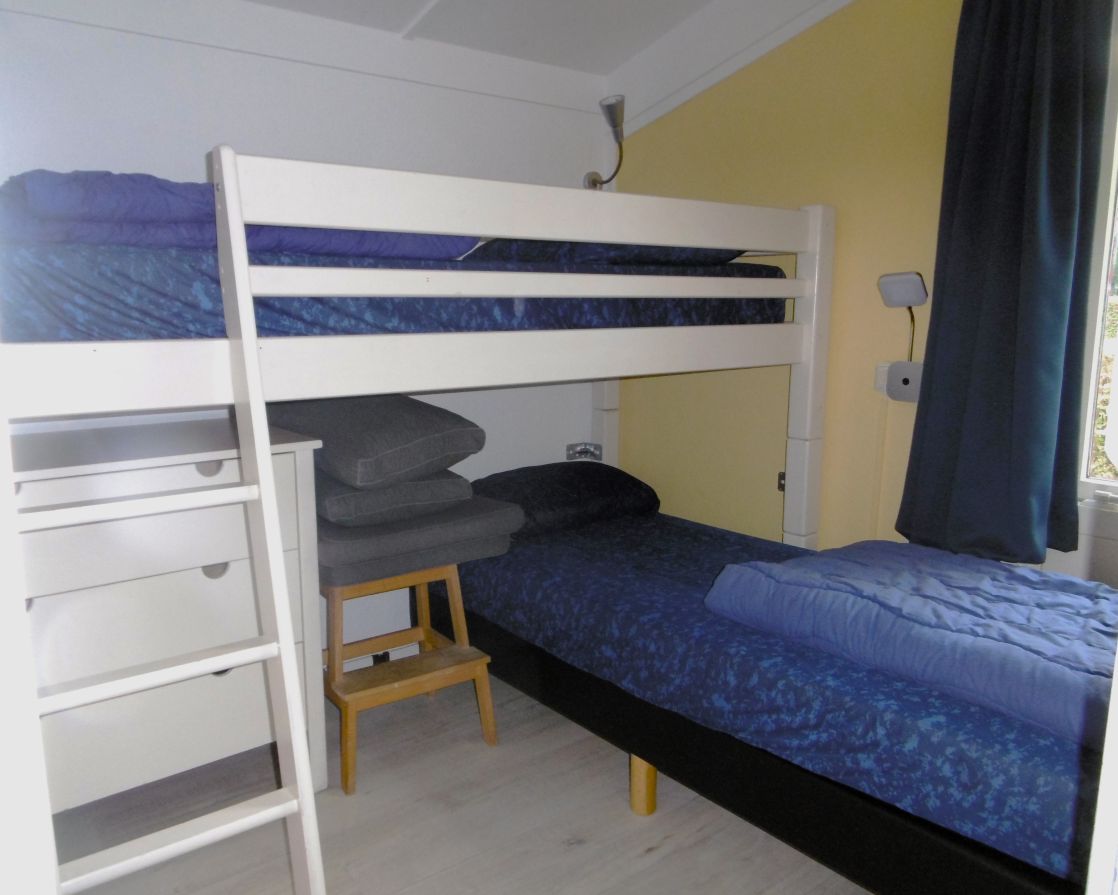 - Das zweite Schlafzimmer verfügt über ein halbhohes Massivholzbett mit einem Einzel-Boxspringbett darunter. Unter dem Bett befindet sich zusätzlicher Stauraum, zum Beispiel für Kleidung oder Spielzeug.
