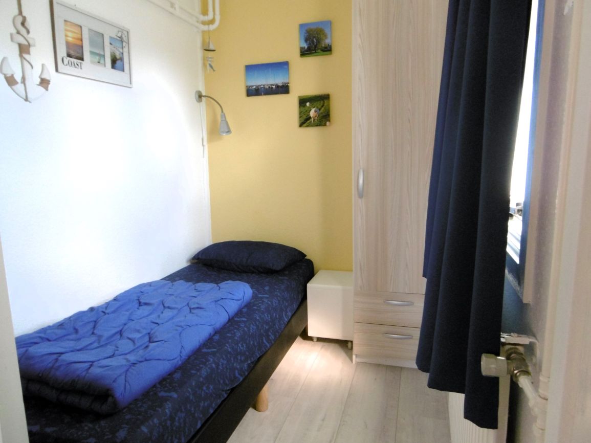 - Das dritte Schlafzimmer ist mit einem Einzel-Boxspringbett und einem Schrank ausgestattet.