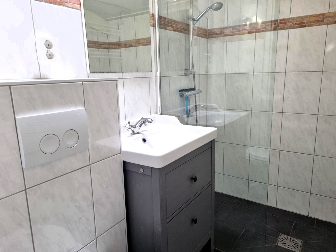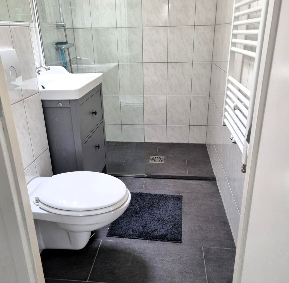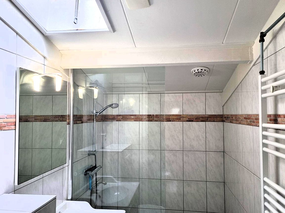 Das Badezimmer wurde vollständig renoviert. Es verfügt über ein wandhängendes WC, einen Designheizkörper, ein Waschbecken mit Unterschrank sowie eine begehbare Dusche mit Glaswand. Ein zusätzliches Dachfenster sorgt für angenehmes Tageslicht und natürliche Belüftung.